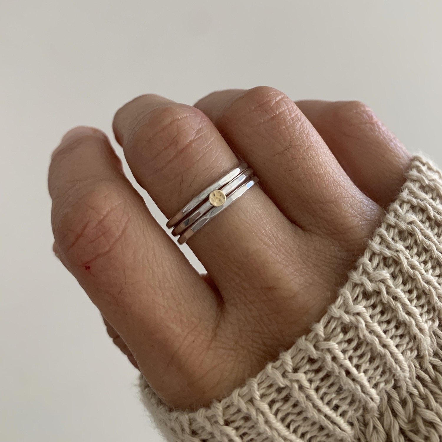 These stacking rings are made out of solid sterling silver and one ring has a 9kt gold dot with a hammered and polished finish.